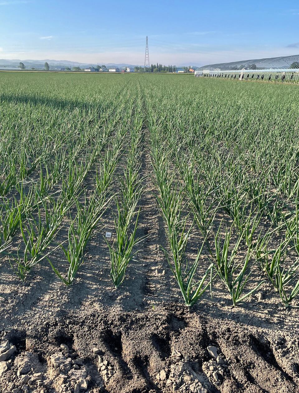 ※2025年夏の北海道は高温と旱魃(かんばつ)で玉葱のサイズが小さめで、収量も例年より少なかったですが、ど根性真珠の玉葱として出荷できました。